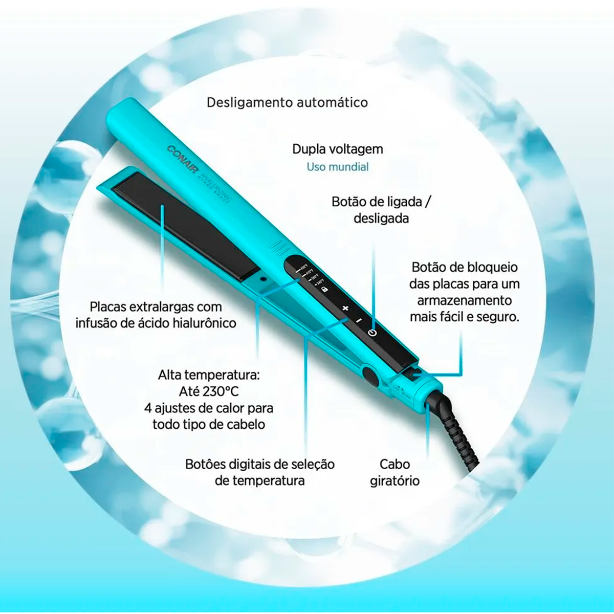 A Prancha Conair CS41DBR Hyaluronic oferece alisamento eficiente aliado ao tratamento capilar. Desenvolvida com tecnologia Hydro Boost, suas placas de cerâmica liberam pó de ácido hialurônico durante o uso, proporcionando hidratação contínua aos fios, redução do frizz e brilho intenso. O equipamento possui aquecimento rápido, garantindo agilidade no preparo, e conta com um display digital LED que permite selecionar entre 4 níveis de temperatura ajustáveis. Com design ergonômico na cor azul, a prancha inclui cabo giratório para maior mobilidade no manuseio e sistema bivolt automático, tornando-se uma ferramenta versátil e prática para qualquer ambiente.