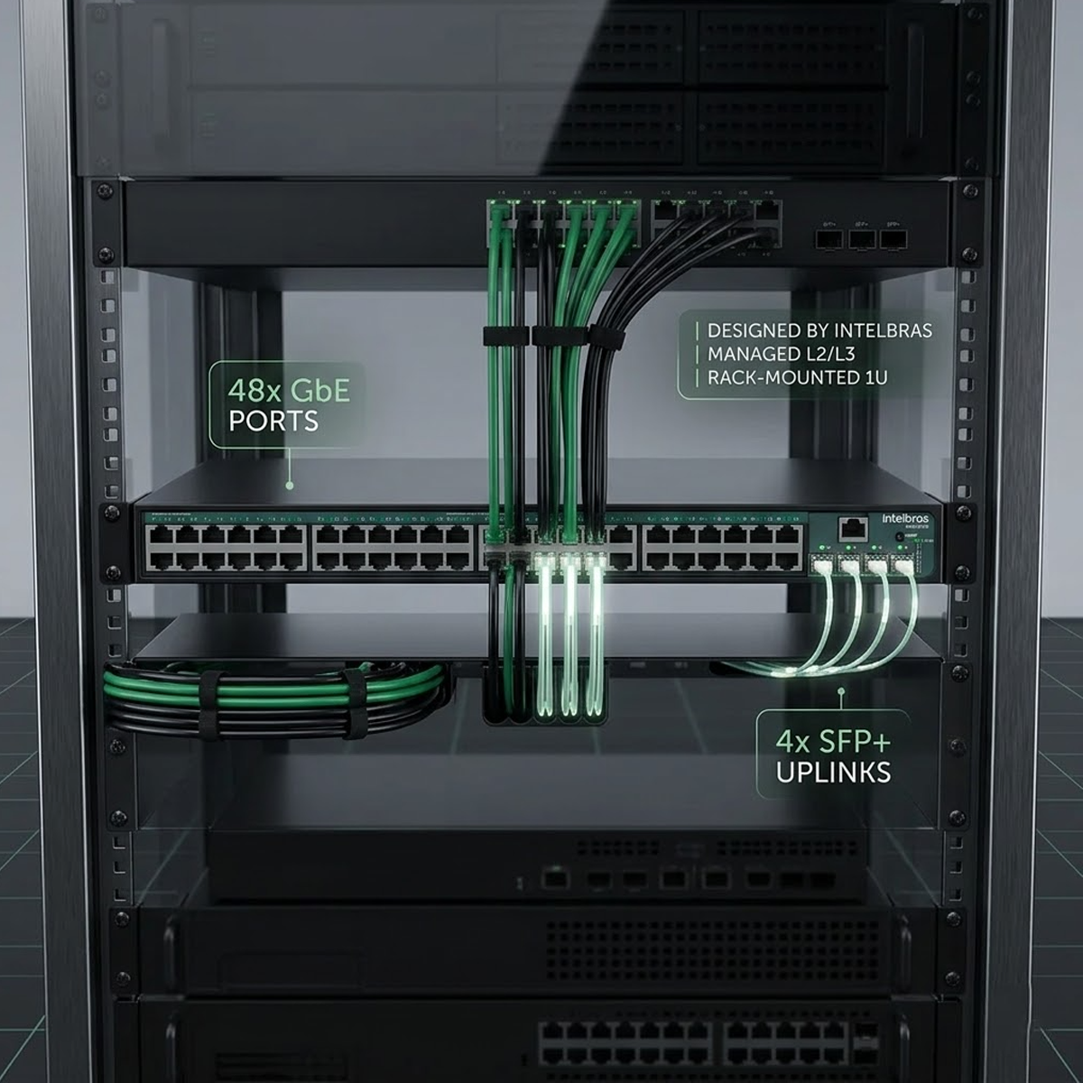 Por ser um switch gerenciável de camada L3, oferece recursos avançados de gerenciamento, roteamento e segmentação de rede, garantindo maior controle e desempenho em ambientes complexos. Além disso, conta com 4 portas SFP+ de 10Gbps, ideais para uplinks de alta velocidade e integração com backbone de rede.